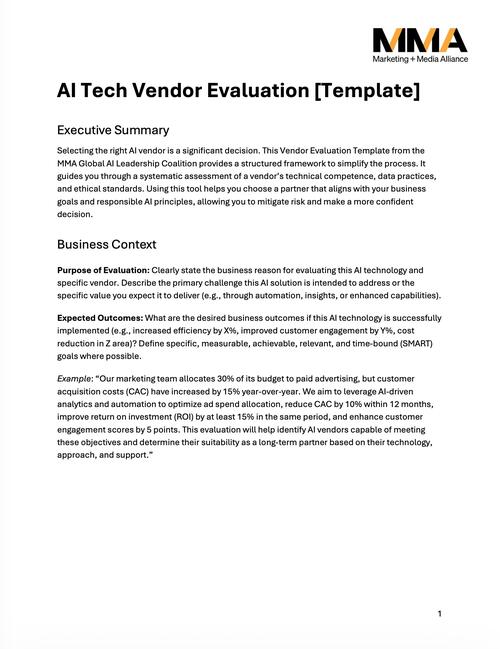 Choosing the right AI vendor is one of the most consequential decisions a marketing team can make. This comprehensive evaluation template, developed by MMA Global’s AI Leadership Think Tank (ALTT), provides a structured framework for assessing AI technology vendors across 13 critical dimensions — from business alignment and technical capabilities to responsible AI practices and procurement readiness. Download it and make it your own.