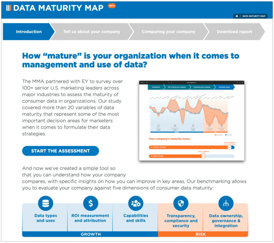 MMA CEO, Greg Stuart, shared: "We believe our Data in Marketing Think Tank (DATT) Data Maturity Assessment tool to be the first of its kind. It will allow marketers to have a level of benchmarking with their industry peers on where their organization is in the journey to better leverage data to orchestrate superior customer experiences, which our MOSTT research into marketing org validates is the most power marketing strategy today. This is very much a beta tool, and our intention is to continue to develop the tool and also enrich it with input from additional marketers, and their Chief Digital Officer counterparts. "